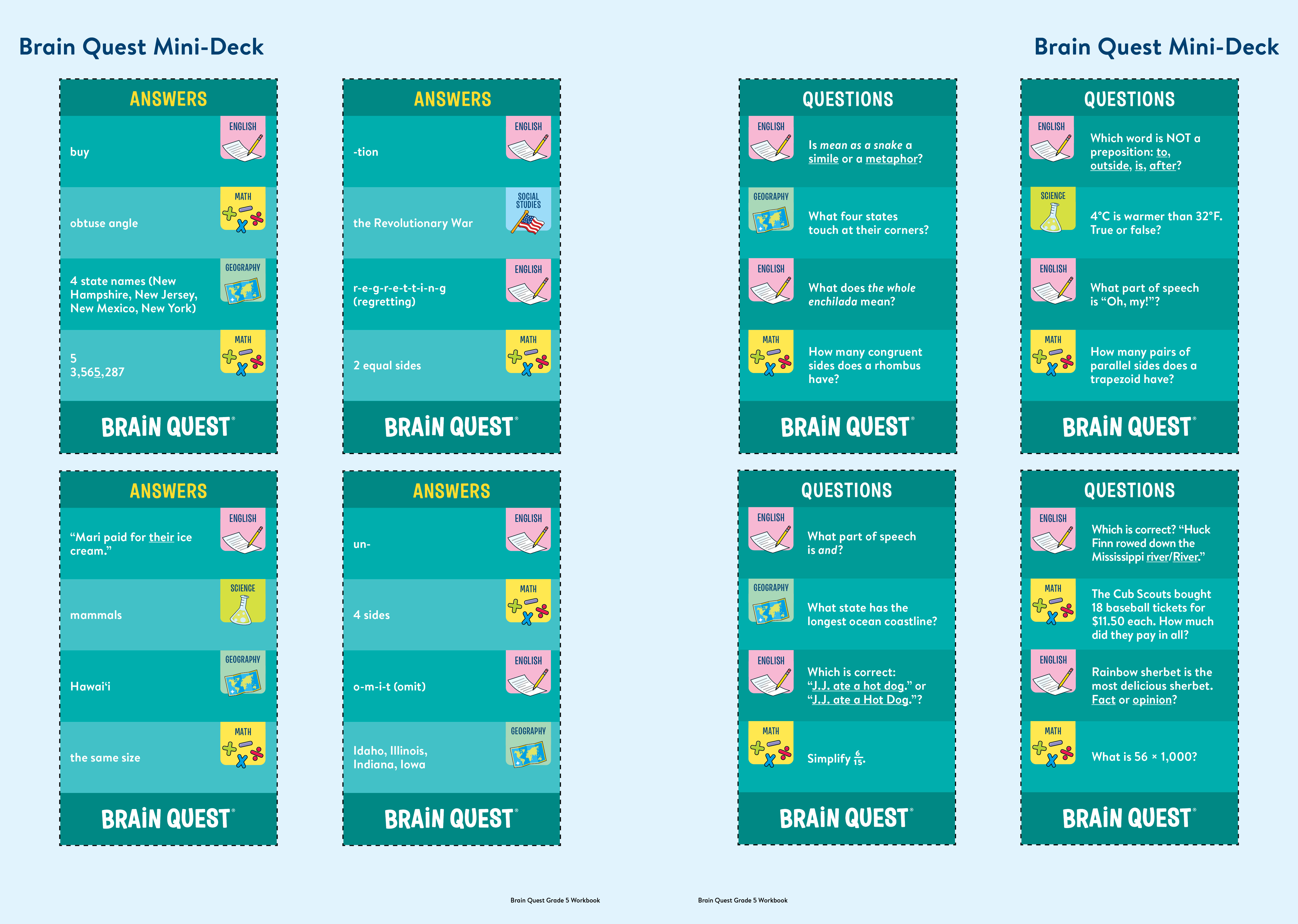 Loved by kids, teacher approved, and trusted by parents, Brain Quest Grade 5 Workbook reviews and reinforces what children are learning in the classroom in an instantly engaging, entertaining way. Each page is jam packed with fun activities, practice exercises, and games covering vocabulary, language arts, math word problems, multiplication and division, fractions and decimals, geometry and measurement, social studies, science, and much more.